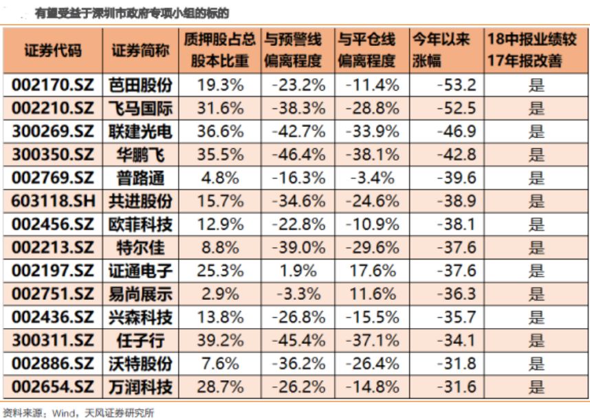 天风证券分析师刘晨明的研究结果显示,截止10月14日,深圳地区股票池中共有75个涉及股票质押且当前股价低于预警线。从今年以来跌幅超过30%和企业业绩处于上行区间(2018年中报净利润较2017年报改善)两个标准来看,共有14家潜在政府专项投资标的股票。